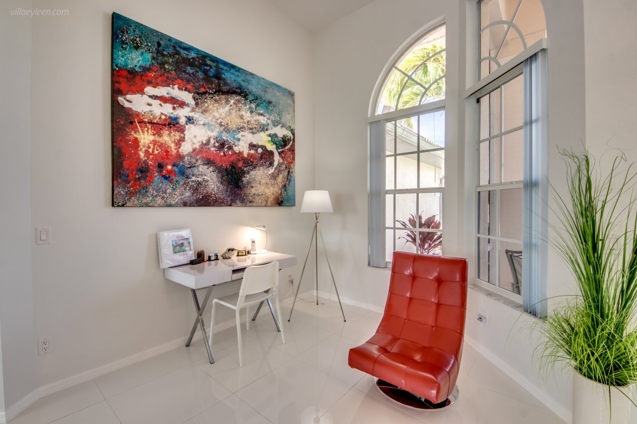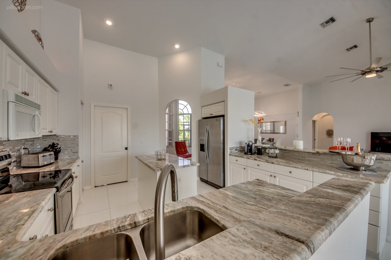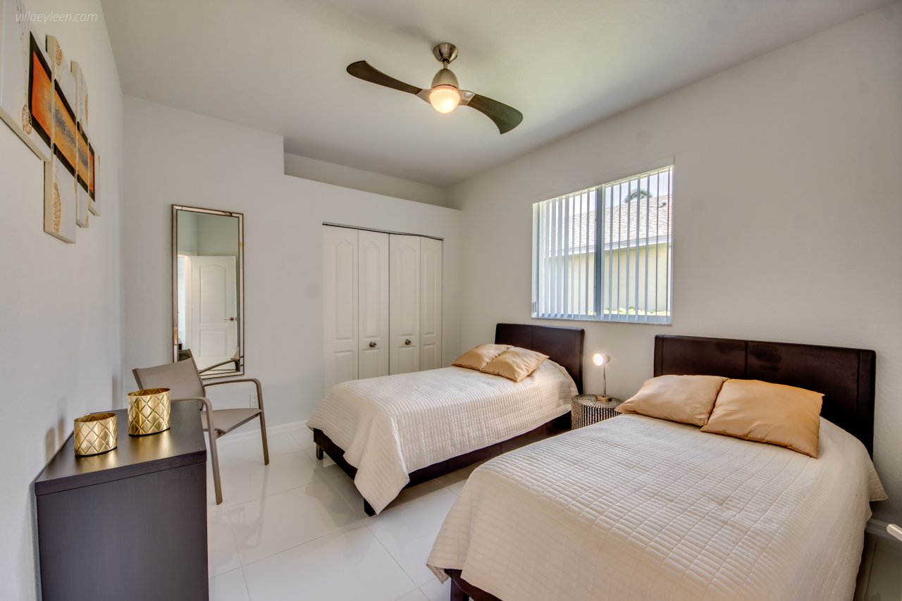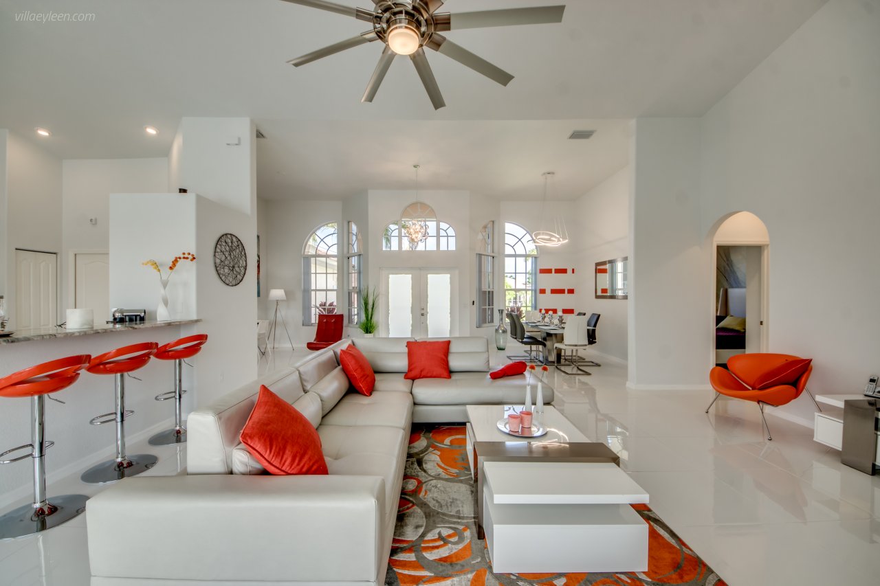 La Villa Eyleen tiene aproximadamente 2300 pies cuadrados de espacio habitable, con 4 dormitorios y 2 baños. Hay un baño accesible desde la piscina. Un techo de tejas macizas, garaje de gran tamaño con pisos de epoxi con acceso directo a la cocina, sala de estar grande con puerta corrediza hacia el exterior: Patio / Lanai y área de la piscina.